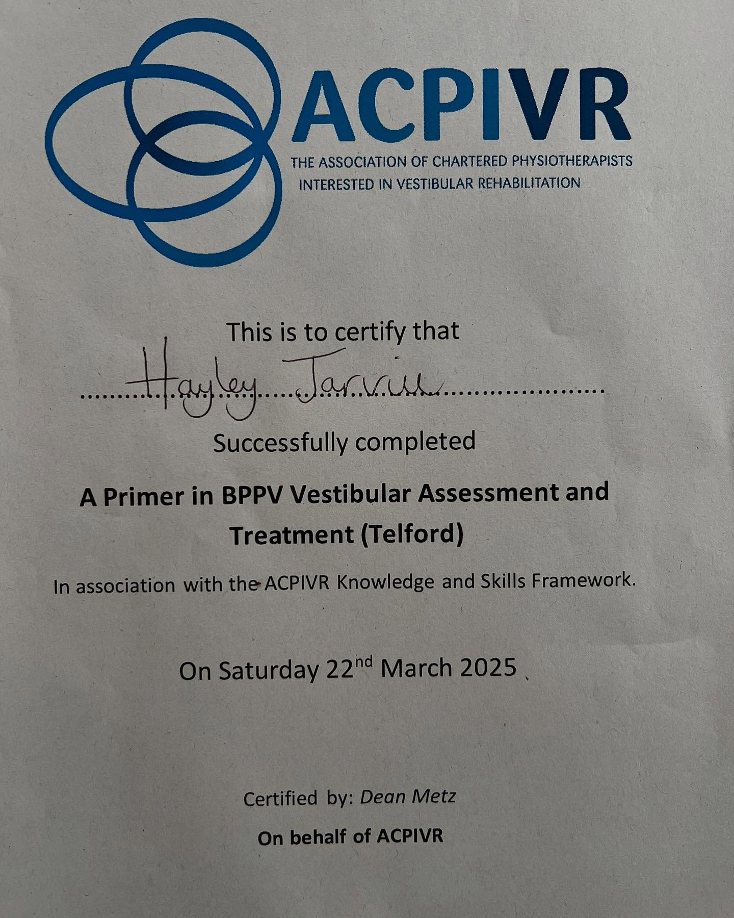 Hayley completes BPPV Course for Vestibular Physiotherapy