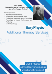 Kate Heeks MSc BSc Sport Psychology (trainee) works with a wide range of clients, from grass roots athletes all the way through to higher level sport participation to work at getting the best out of physical performance by facilitating the best mental preparation.